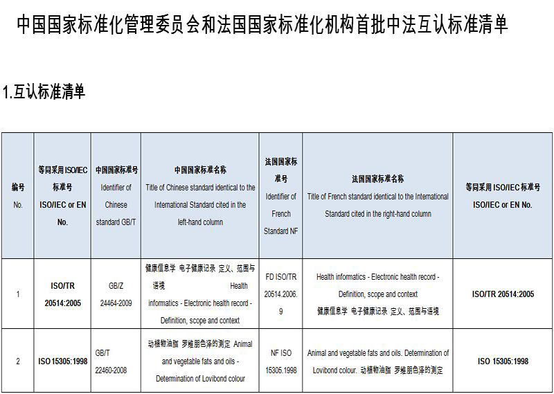根据《中华人民共和国国家质量监督检验检疫总局 国家标准化管理委员会与法兰西共和国标准化协会联合制定国际标准和推动双方标准相互采用的合作协议》,为推动中法标准互认工作,提升中法标准一致性程度,有效促进中法两国经贸发展,按照《中法标准互认操作指南》和《标准互认工作程序》要求,2017年4月28日,中国国家标准化管理委员会与法国国家标准化机构在法国巴黎确认了《中国国家标准化管理委员会和法国国家标准化机构首批中法互认标准清单》,现将有关事项公告如下: