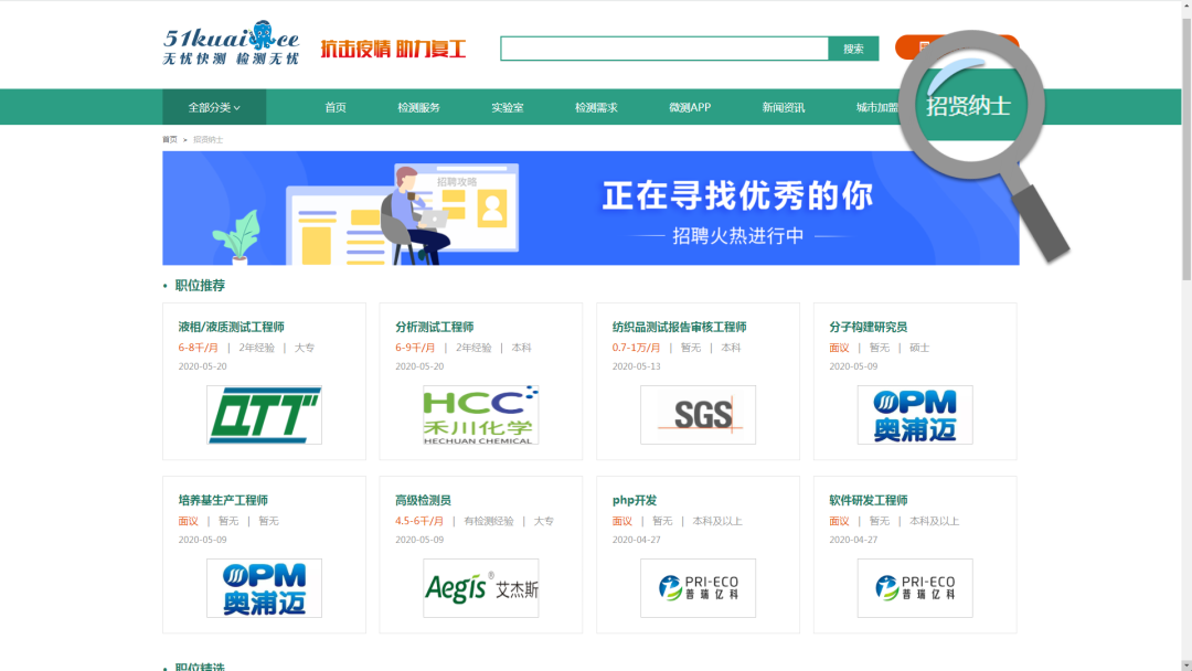 无忧快测汇集了检测行业众多高端人才,招聘信息传递精准,为“人才荒”的企业提供了一个量级庞大的曝光机会,让您轻松找到对的人!
