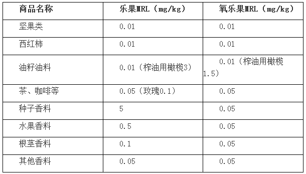 2017年6月23日,欧盟委员会发布(EU) 2017/1135号法规,修订(EC)396/2005法规附件II和附件III中乐果(dimethoate)和氧乐果(omethoate)最大残留限量(MRL),于官方公报发布后20天生效,并于2018年1月17日实施,部分残留限量如下: