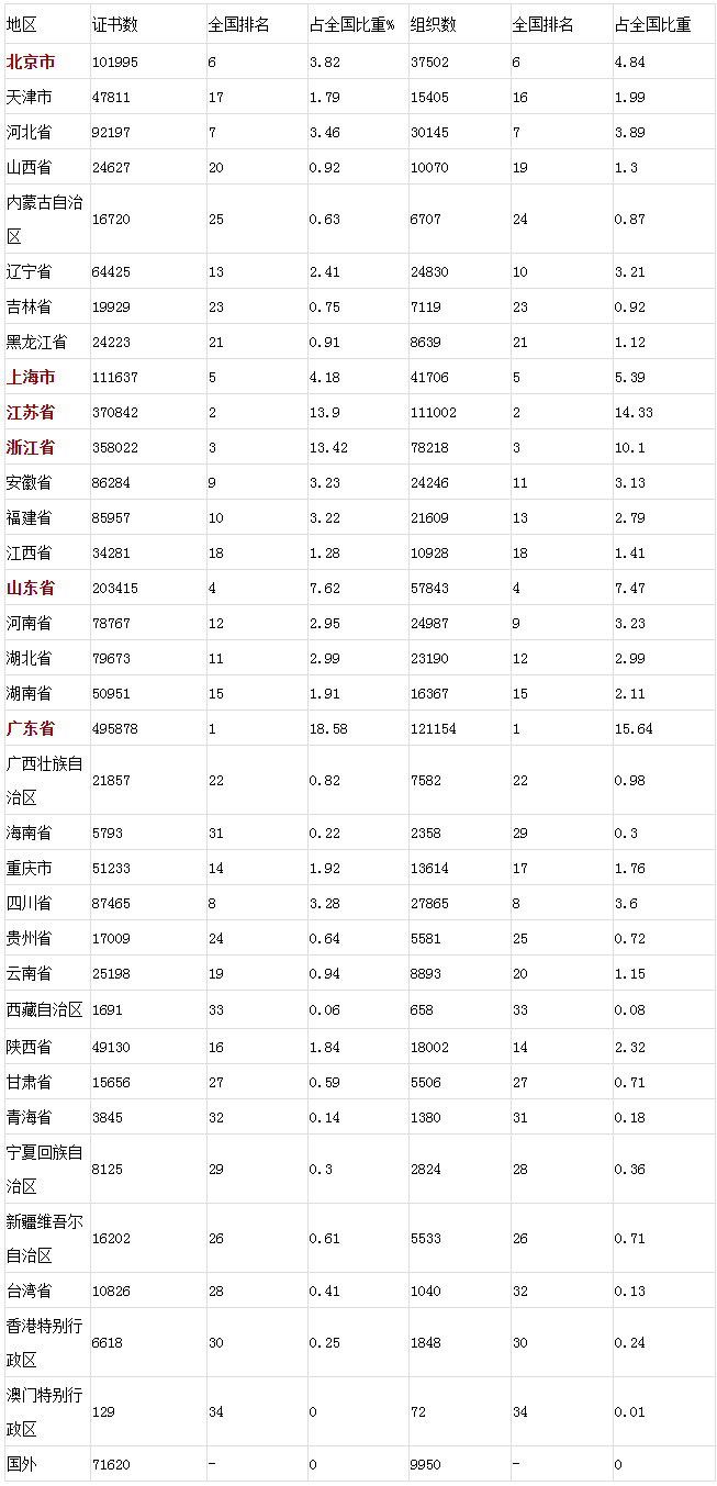 截至2020年11月,我国有效认证证书数为266万,获证企业数77万。其中证书数10万以上的省份六个,分别为广东495878张、江苏370842张、浙江358022张、山东203415张、上海111637张和北京101995张。