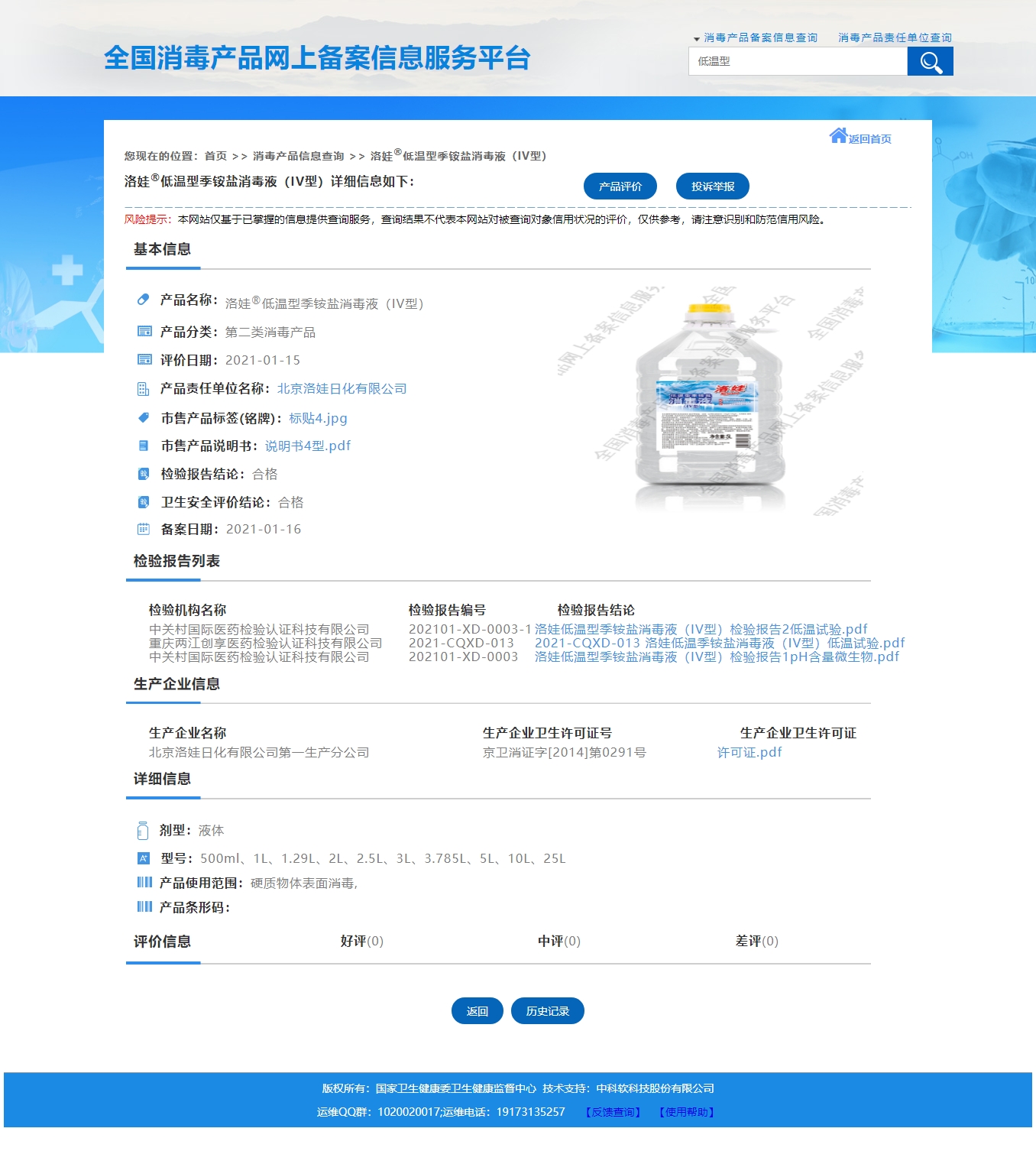 1月18日,国家卫健委全国消毒产品网上备案信息服务平台显示,洛娃低温型季铵盐消毒液(Ⅰ型)和洛娃低温型季铵盐消毒液(IV型)已获国家备案批准正式上市。这两款新低温型消毒液将有效解决我国冷链食品外包装消毒难题。