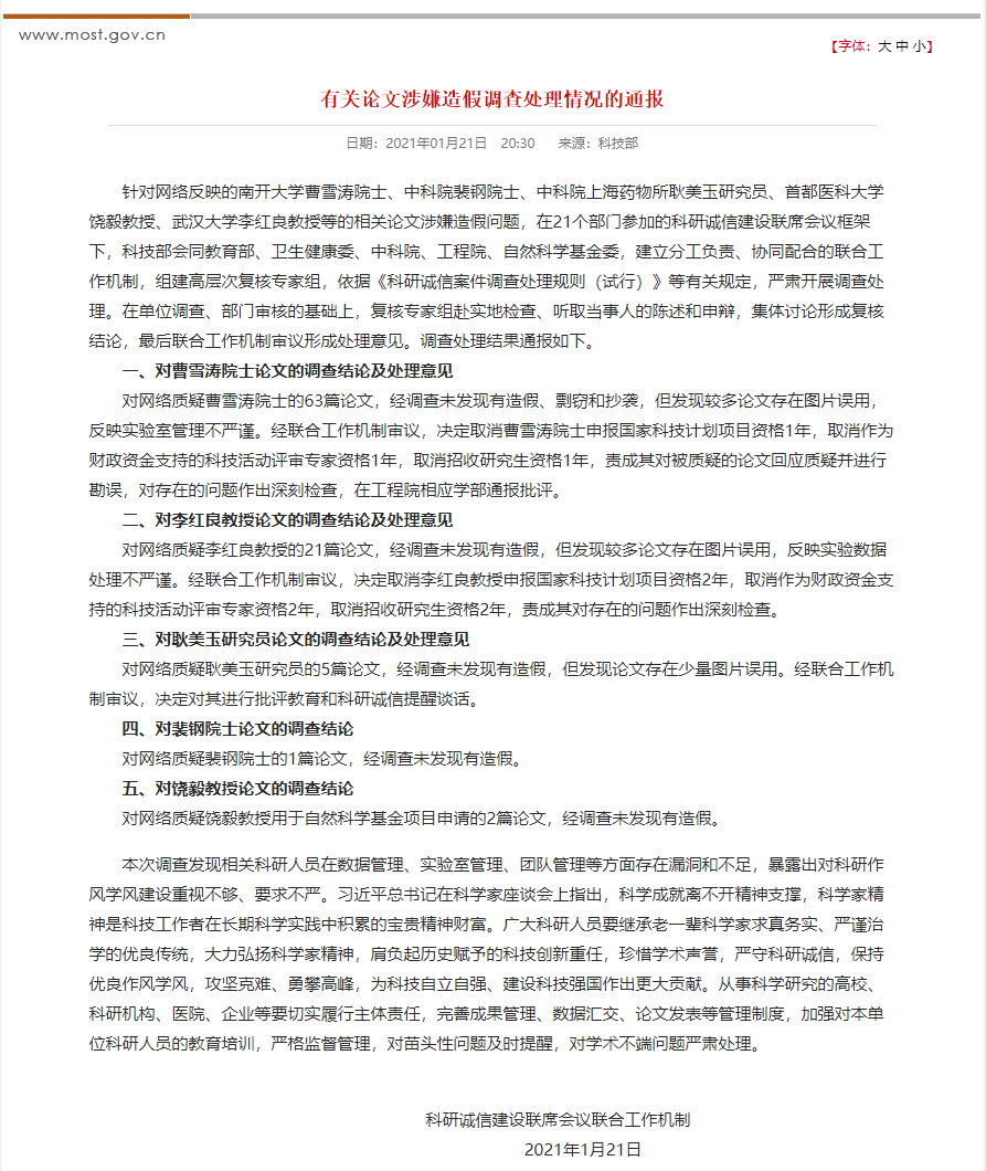 针对网络反映的南开大学曹雪涛院士、中科院裴钢院士、中科院上海药物所耿美玉研究员、首都医科大学饶毅教授、武汉大学李红良教授等的相关论文涉嫌造假问题,在21个部门参加的科研诚信建设联席会议框架下,科技部会同教育部、卫生健康委、中科院、工程院、自然科学基金委,建立分工负责、协同配合的联合工作机制,组建高层次复核专家组,依据《科研诚信案件调查处理规则(试行)》等有关规定,严肃开展调查处理。在单位调查、部门审核的基础上,复核专家组赴实地检查、听取当事人的陈述和申辩,集体讨论形成复核结论,最后联合工作机制审议形成处理意见。调查处理结果通报,请看下图: