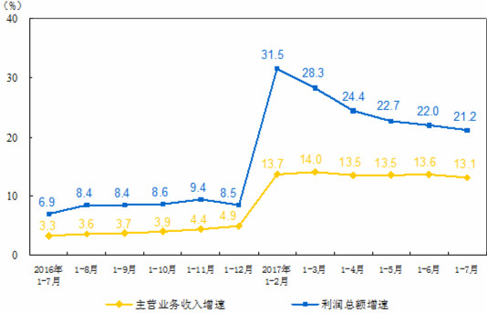 1-7月份,采矿业实现利润总额2795.5亿元,同比增长7.9倍;制造业实现利润总额37413.1亿元,增长18.1%;电力、热力、燃气及水生产和供应业实现利润总额2272.6亿元,下降25.3%。