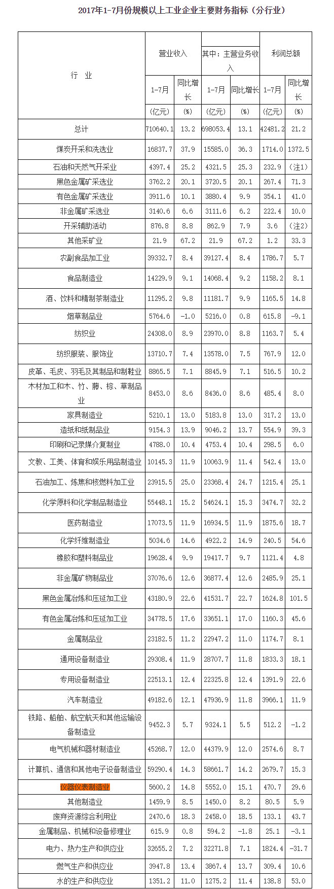 8月27日,国家统计局发布1-7月份全国规模以上工业企业利润总额情况。1-7月份,全国规模以上工业企业实现利润总额42481.2亿元,同比增长21.2%,增速比1-6月份放缓0.8个百分点。其中,仪器仪表制造业实现利润总额470.7亿元,同比增长29.6%。