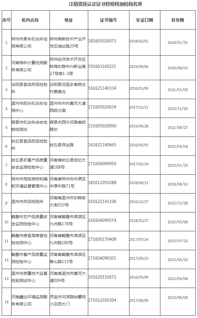 根据《中华人民共和国计量法》《中华人民共和国行政许可法》和《检验检测机构资质认定管理办法》等有关规定,郑州市易车机动车检测有限公司等14家检验检测机构主动提出注销申请,依法予以注销。现将依法注销资质认定证书的检验检测机构名单(见附件)予以公布,接受社会监督。