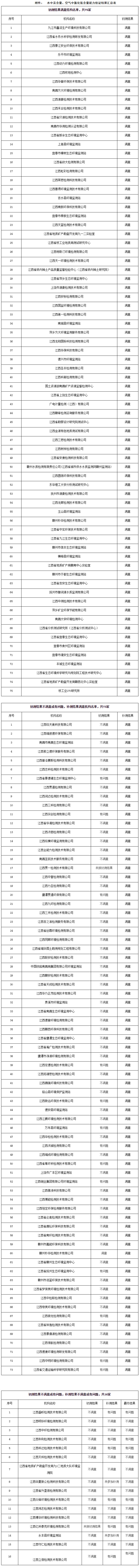 (一)初测结果满意的九江市鑫洁生产环境科技有限公司等75家检验检测机构及承担能力验证项目的技术支持单位,下一年度接受检验检测机构资质认定时,可免于相关项目的现场考核。