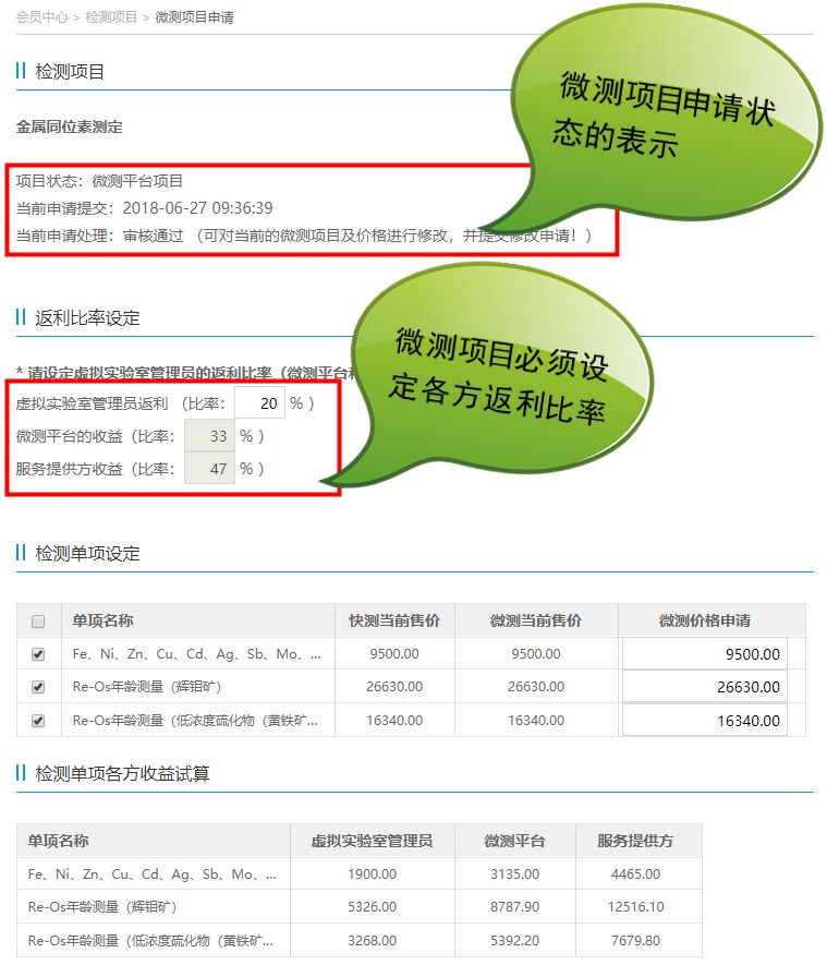 在您追加完成的检测项目下面,点击【微测项目申请】选项,进入微测项目申请画面: