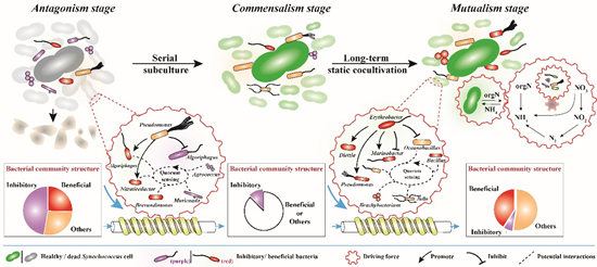为了验证这一现象的可重复性和背后机制,张增虎团队通过人工构建聚球藻与自然海水微生物群落的共存体系,研究了聚球藻与共生菌群在长期共存(近3年)下的互作关系变化以及背后潜在的营养循环机制,揭示藻菌关系历经彼此敌对、共存、再到最终的互利共生关系的动态变化过程。同时发现在藻菌敌对阶段,抑藻菌(46%)占据优势,但菌群中同样存在着26%的促藻菌。随着聚球藻与异养菌群共存时间的延长,不同细菌间的复杂互作(如群体感应、相互促进或敌对等)共同推动了细菌群落结构的动态演替,并伴随着促藻菌与抑藻菌比率的变化,最终实现聚球藻与细菌群落的互利共生,建立了可自给自足的内部营养循环(尤其是氮循环),使得它们在没有任何外部营养供应的情况下得以长期生存。宏基因组分析和具功能活性的固氮菌的成功分离表明共生体系中丰富的氮营养可能主要来自于异养微生物的固氮作用。