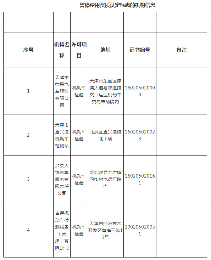 天津市益昌汽车服务有限公司、天津市宜兴埠机动车检测站、涉县天铁汽车服务有限责任公司、吉通机动车检测服务(天津)有限公司基本条件和技术能力不能持续符合资质认定条件和要求,根据《检验检测机构资质认定管理办法》的规定,决定暂停上述机构使用资质认定标志。从即日起,上述机构不得向社会出具具有证明作用的检验检测数据、结果。