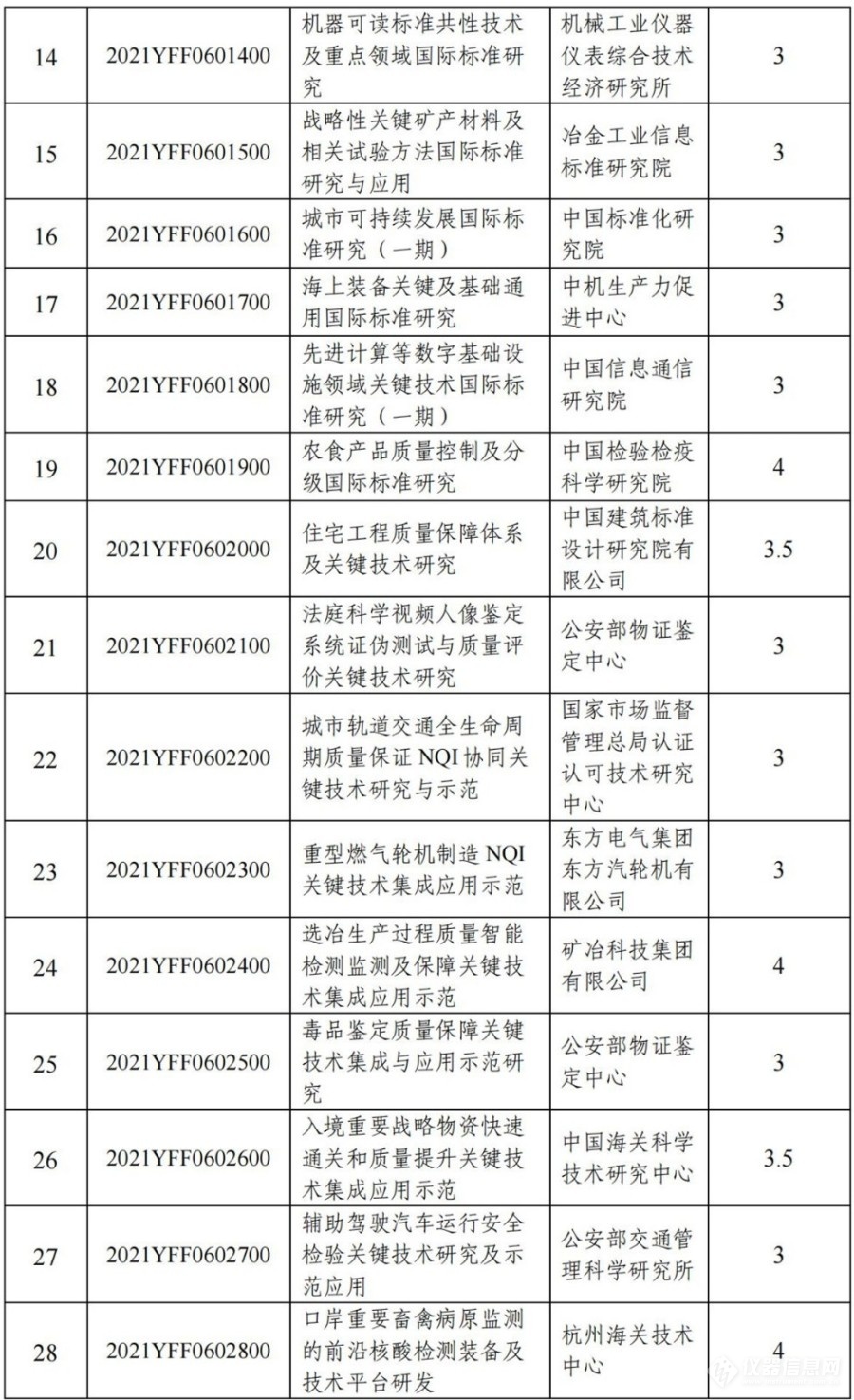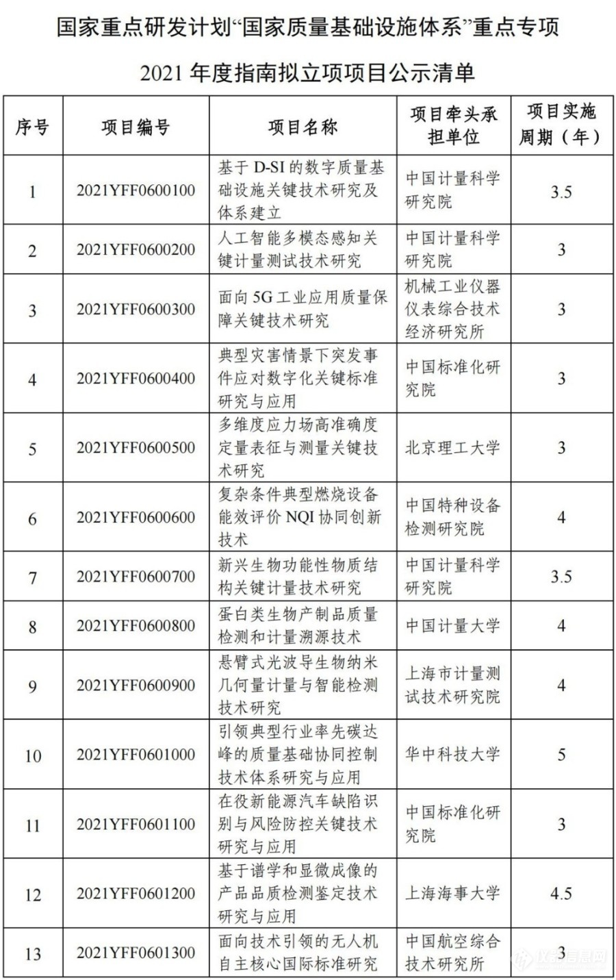 内容显示,共有36个项目进入国家重点研发计划“国家质量基础设施体系”重点专项2021年度指南拟立项项目公示清单,其中包括机械工业仪器仪表综合技术经济研究所“面向5G工业应用质量保障关键技术研究”项目、北京理工大学“多维度应力场高准确度定量表征与测量关键技术研究”项目、上海海事大学“基于谱学和显微成像的产品品质检测鉴定技术研究与应用”项目、深圳市计量质量检测研究院“医用电子仪器先进制造质量基础设施关键技术集成应用示范”项目等。