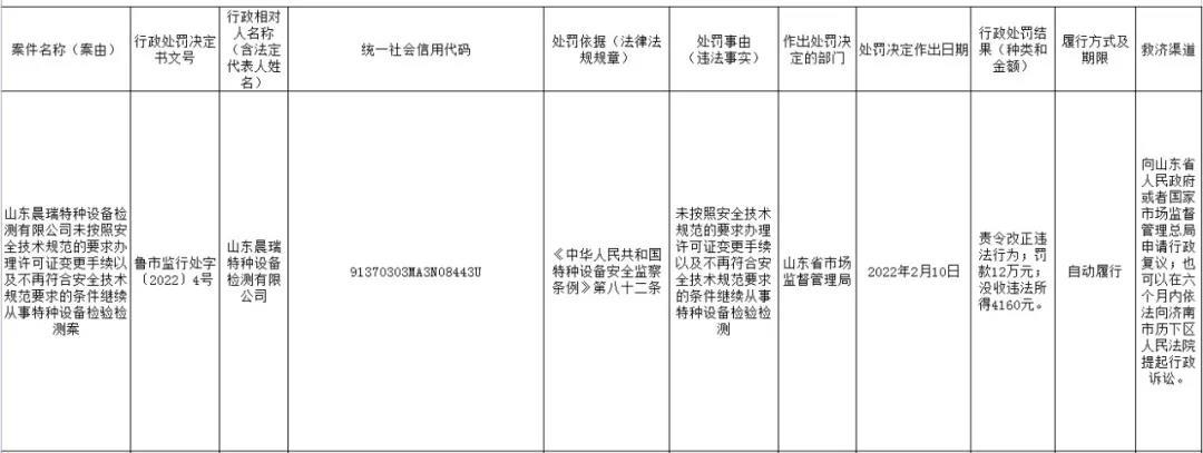 近日,山东省市场监督管理局对行政处罚案件信息进行公示,山东晨瑞特种设备检测有限公司因未按照安全技术规范的要求办理许可证变更手续以及不再符合安全技术规范要求的条件继续从事特种设备检验检测,被责令改正违法行为,罚款12万元,没收违法所得4160元。
