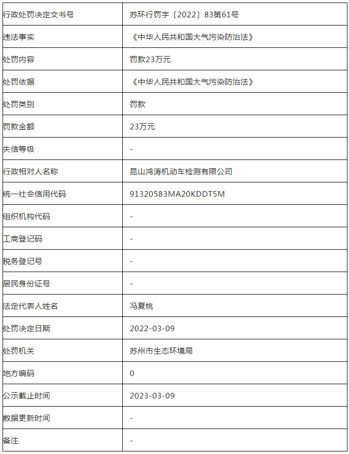 因违反《中华人民共和国大气污染防治法》被罚款23万元的通告。