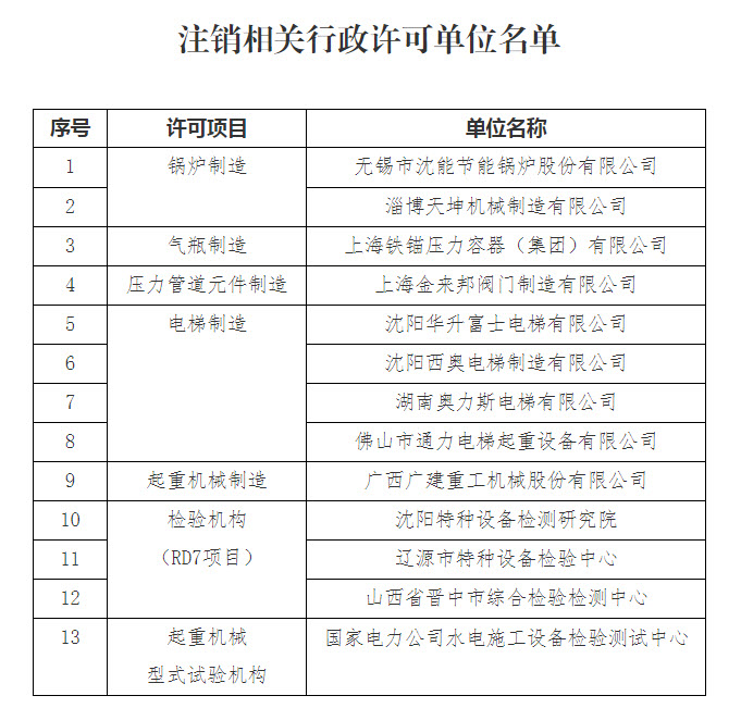 (二)依法注销13家特种设备生产单位和检验检测机构有关行政许可资质(详见附件1)。