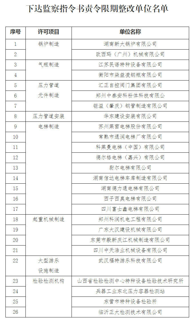 (三)属地市场监管部门已对26家特种设备生产单位和检验检测机构(详见附件2)下达监察指令书,责令限期整改。上述单位要对监督抽查发现的问题认真整改,并将整改情况报送当地市场监管部门。上述单位下一许可周期不允许申请自我声明承诺换证。