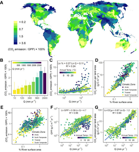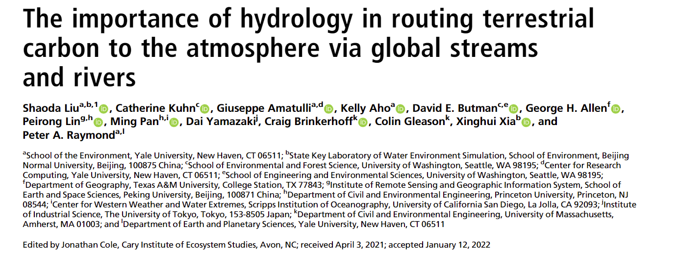该研究成果以“The importance of hydrology in routing terrestrial carbon to the atmosphere via global streams and rivers”为题发表在2022年3月7号的PNAS杂志上。北京师范大学刘少达博士、耶鲁大学Peter Raymond教授共同领导了该研究。该研究合作者包括Catherine Kuhn(华盛顿大学)、Giuseppe Amatulli(耶鲁大学), Kelly Aho(耶鲁大学), David Butman(华盛顿大学), George Allen(德克萨斯农工大学), Peirong Lin(北京大学), Ming Pan(普林斯顿大学), Dai Yamazaki(日本东京大学), Craig Brinkerhoff(麻省大学), Colin Gleason(麻省大学)和夏星辉教授(北京师范大学)。