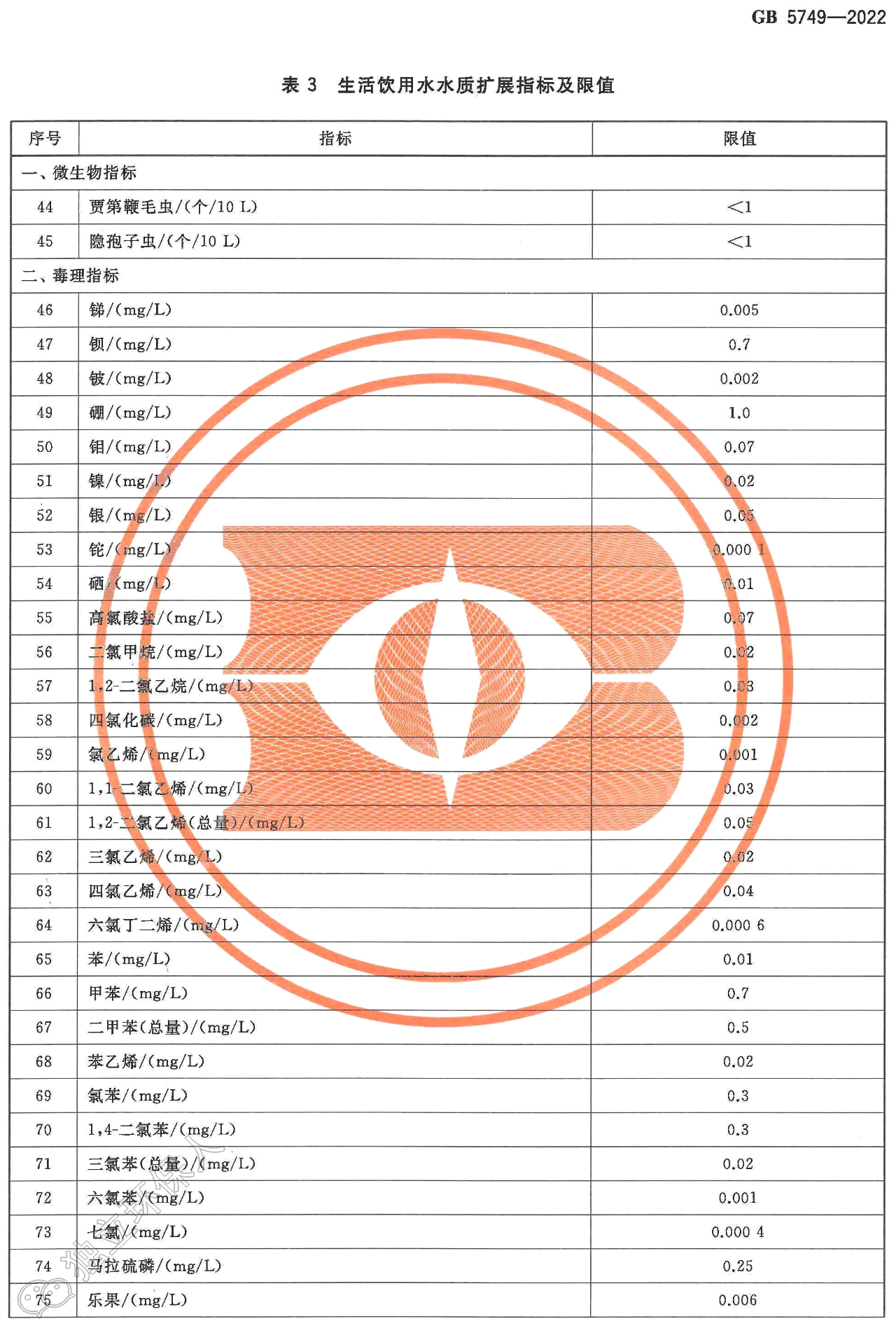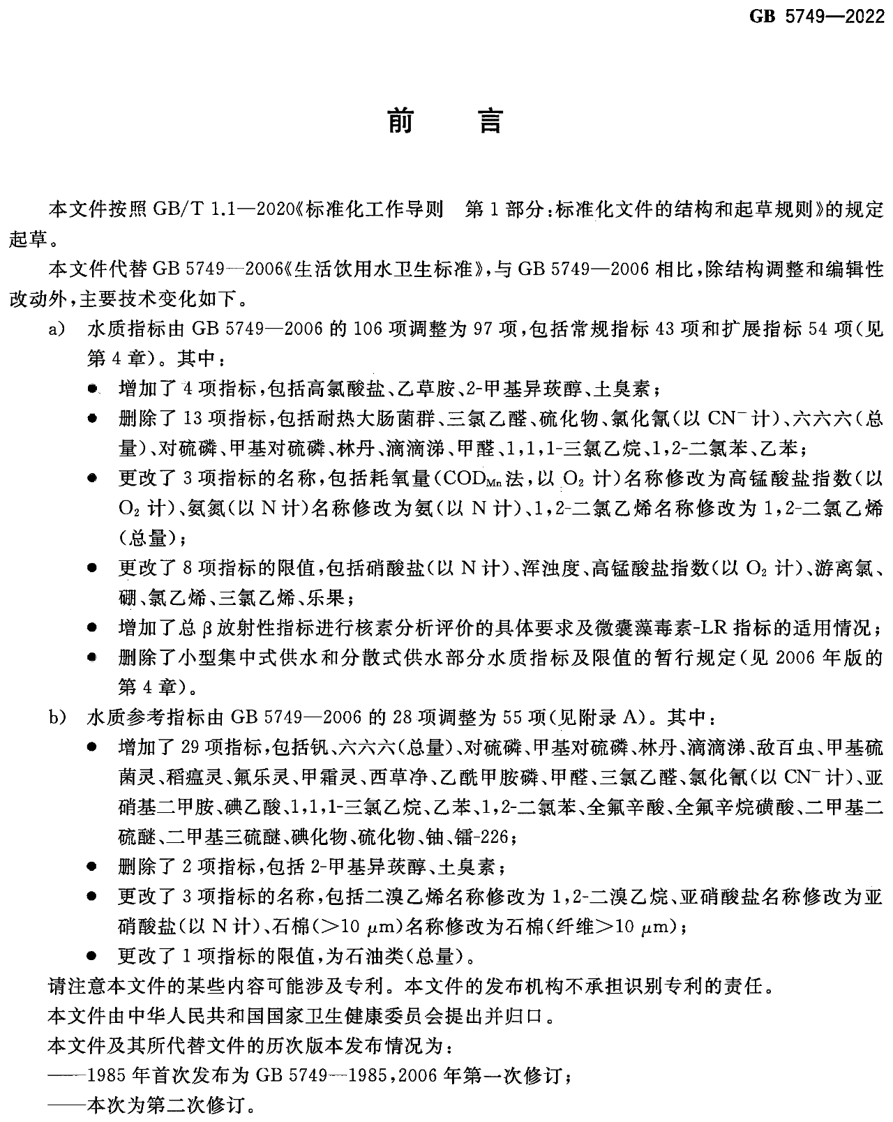 GB 5749-2022《生活饮用水卫生标准》于2022年3月15日经国家市场监督管理总局(国家标准化管理委员会)批准发布,代替GB 5749-2006《生活饮用水卫生标准》,自2023年4月1日起实施。