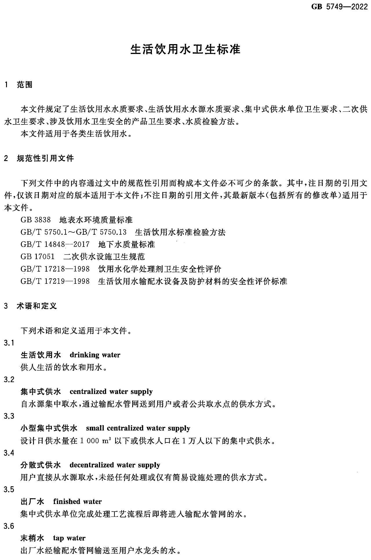 本文件规定了生活饮用水水质要求、生活饮用水水源水质要求、集中式供水单位卫生要求、二次供水卫生要求、涉及饮用水卫生安全的产品卫生要求、水质检验方法。本文件适用于各类生活饮用水。
