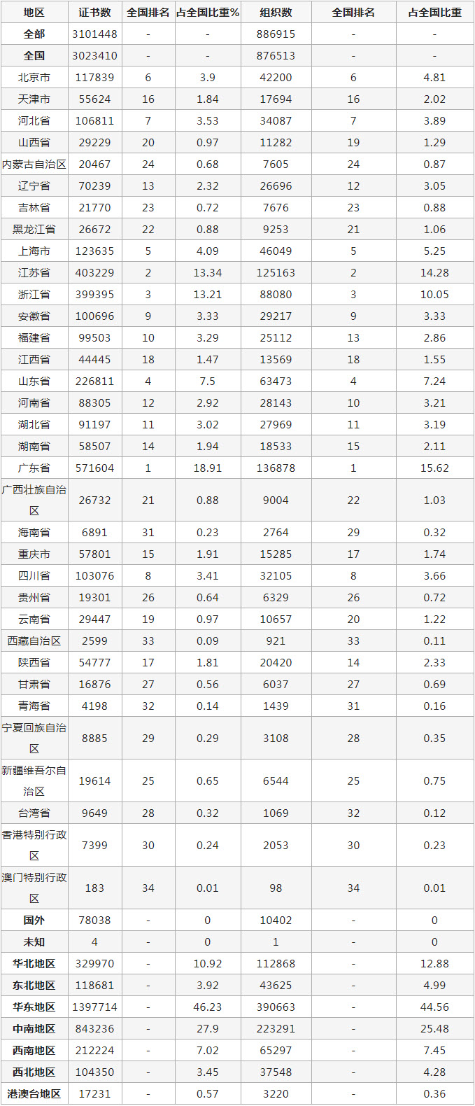 截至2022年3月,我国有效认证证书数为302万张,获证企业数为87万家。其中证书数10万以上的省、市9有个,分别为广东571604张、江苏403229张、浙江399395张、山东226811张、上海123635张、北京117839张、河北106811张、四川省103076张、和安徽省100696张。