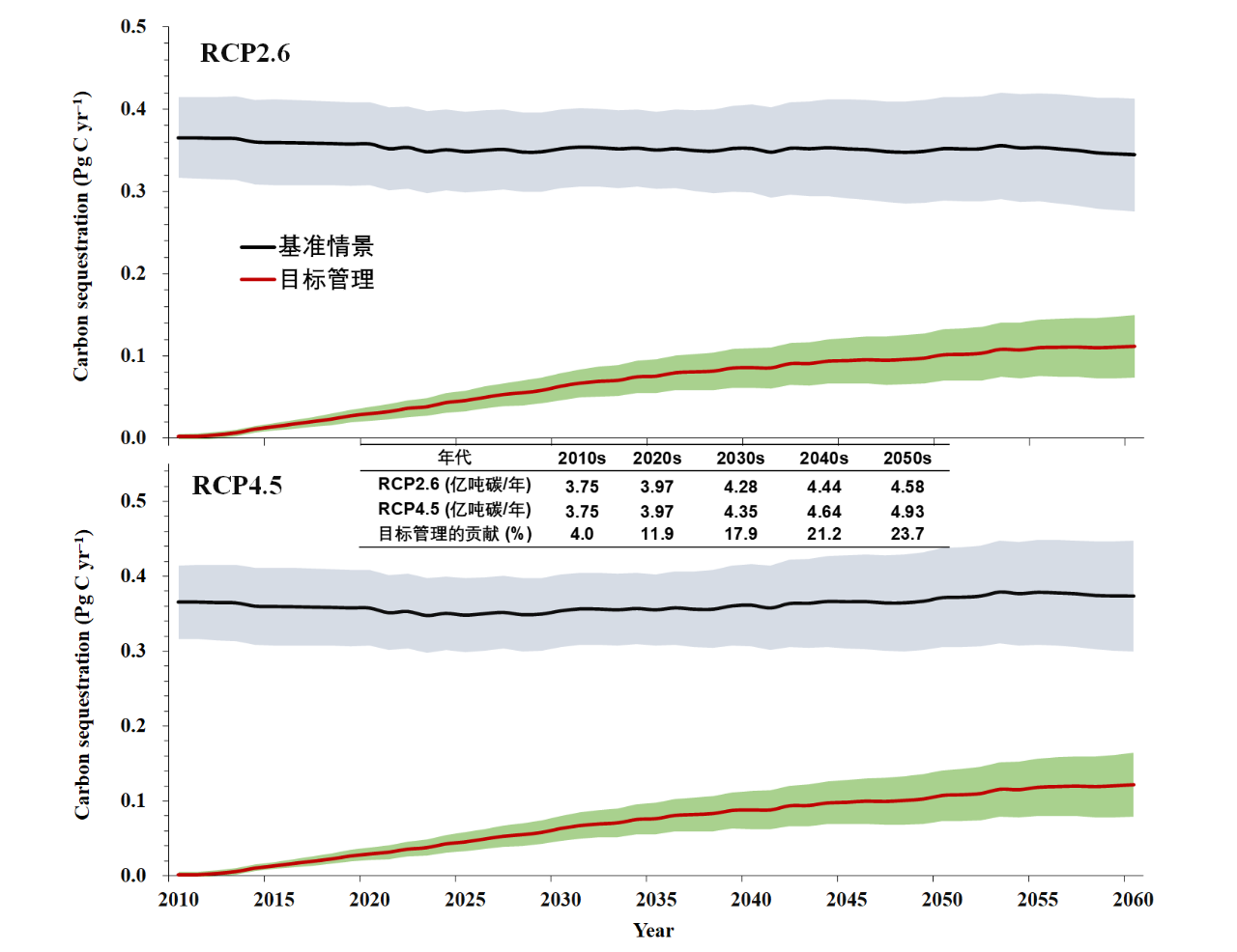 数值② / (数值① + 数值②),即为目标管理对我国陆地生态系统碳汇的贡献。计算结果显示,至2050-2059年,目标管理对我国陆地生态系统碳汇的贡献将接近24%(见上图中的表)。