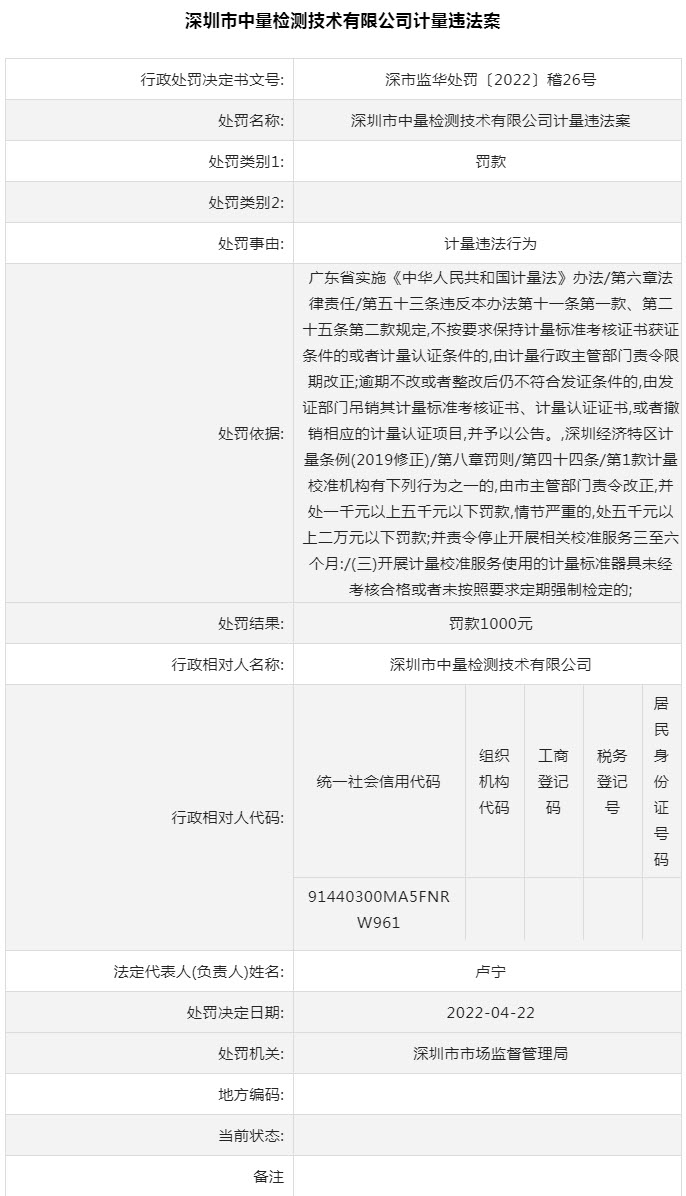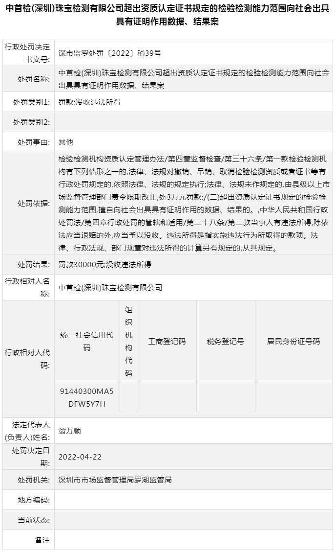 近日,深圳市市场监督管理局对3件违法案例进行通报。其中,深圳市中量检测技术有限公司因计量违法行为被罚1000元,深圳市中测计量检测技术有限公司因计量违法行为被罚10000元,中首检(深圳)珠宝检测有限公司因超出资质认定证书规定的检验检测能力范围向社会出具具有证明作用数据、结果被罚30000元。案件详情如下: