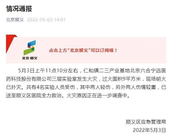 据北京顺义官微消息,5月3日上午11点10分左右,仁和镇二三产业基地北京六合宁远医药科技股份有限公司三层实验室发生火灾,过火面积9平方米,现场明火已扑灭。共有4名实验人员受伤,其中两人轻伤,另外两人伤情较重,已送至顺义区医院全力救治。火灾原因正在进一步调查中。