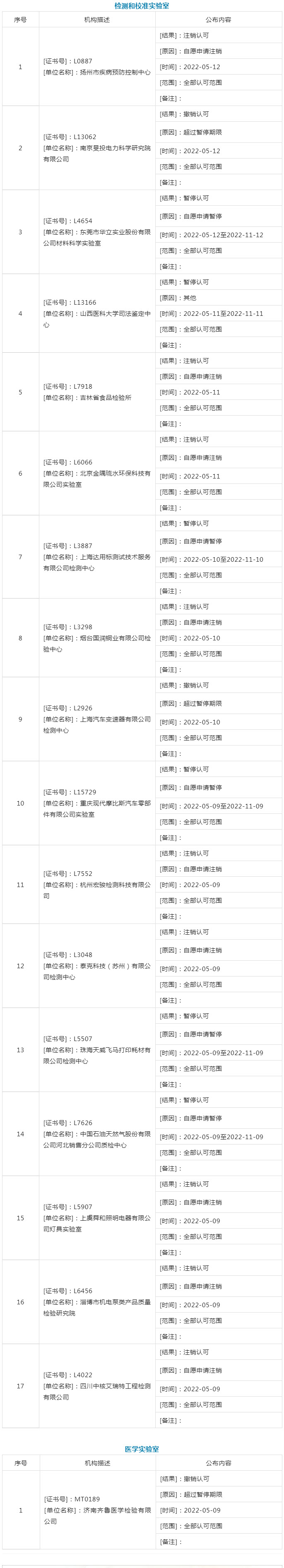 据中国合格评定国家认可委员会消息,5月上半月共计18家机构暂停/撤销/注销认可资质。