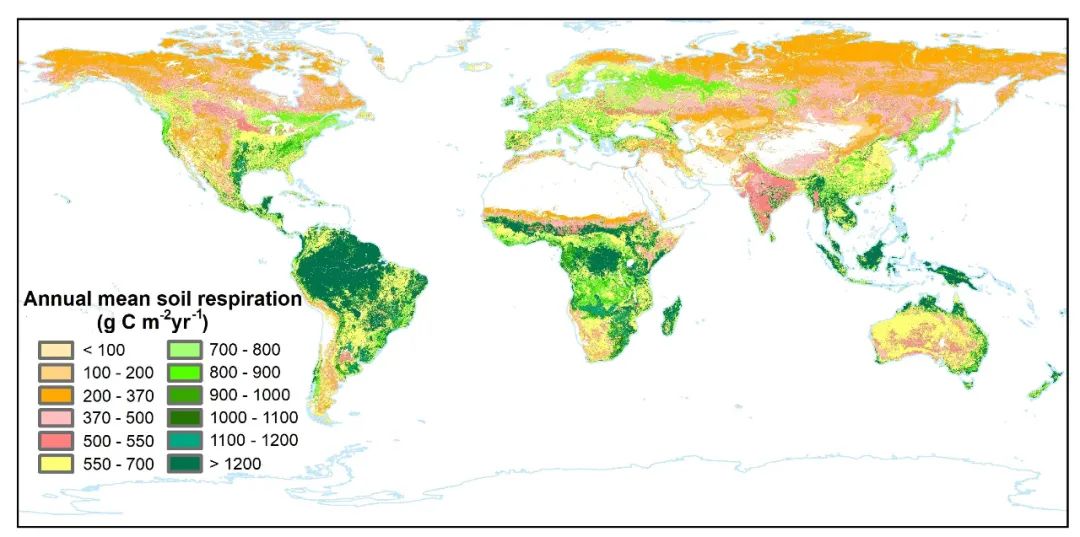 近日,国家地球系统科学数据中心(以下简称“本中心”)更新发布全球1km年土壤呼吸产品(2000-2020年)。该数据产品由中国科学院空天信息创新研究院遥感科学国家重点实验室牛铮研究员团队研制生产。在原来发布的2000-2014年全球陆地生态系统呼吸产品的基础上,对模型输入数据中的缺失值进行了插补,并更新了数据的时间序列。数据可以为全球变化与碳循环研究提供数据支持。相关论文已在国际学术期刊《Science Advances》(2021年影响因子/中科院分区(基础版):14.136/综合性期刊1区Top)上发表。目前,该数据已在本中心开放共享,可在线获取,欢迎相关研究人员下载使用。
