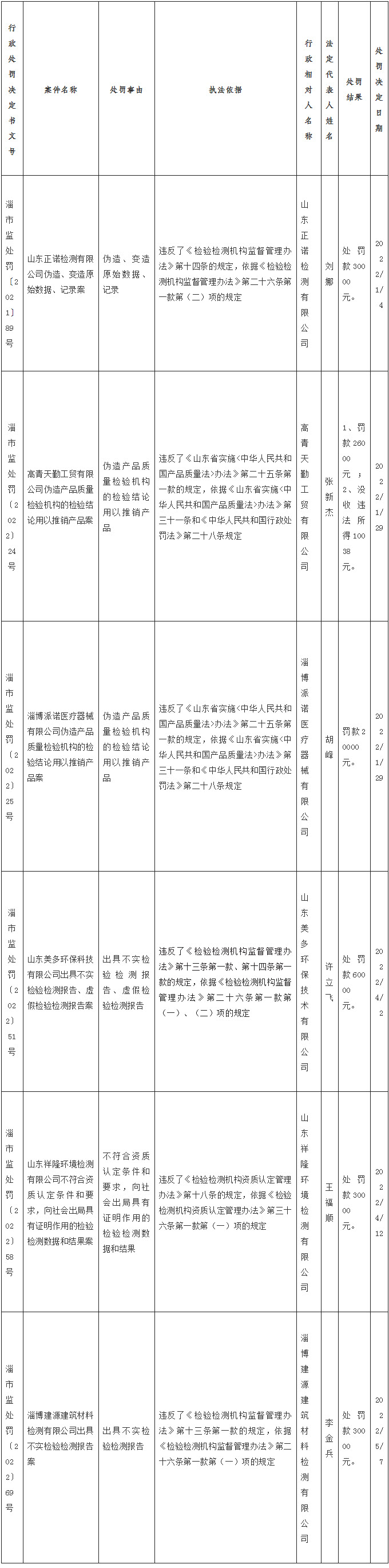 2022年5月23日,山东省淄博市市场监督管理局网站发布淄博华雪建材有限公司等45家单位行政处罚案。其中,山东正诺检测有限公司伪造、变造原始数据、记录被处罚款30000元。山东美多环保科技有限公司出具不实检验检测报告、虚假检验检测报告被处罚款60000元。山东祥隆环境检测有限公司不符合资质认定条件和要求,向社会出局具有证明作用的检验检测数据和结果被处罚30000元。淄博建源建筑材料检测有限公司出具不实检验检测报告被处罚款30000元。