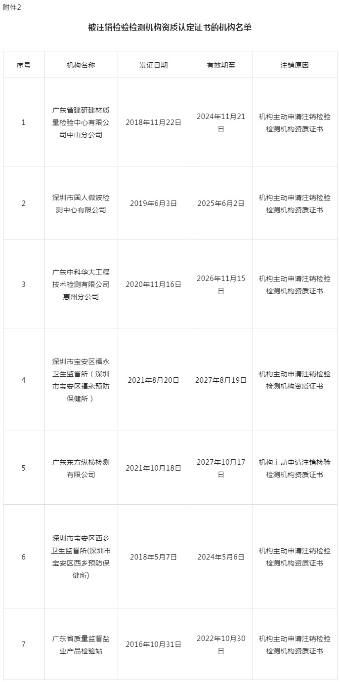 近日,广东省市场监督管理局发布关于注销行政许可证书的通告,注销广东省建研建材质量检验中心有限公司中山分公司等7家检验检测机构资质认定证书;江苏省市场监督管理局发布通告,注销丹阳市广胜机动车环保检测有限公司等7家检验检测机构资质认定证书;天津市市场监管委发布通告,注销天津天衡工程检测有限责任公司等7家机构资质认定证书。