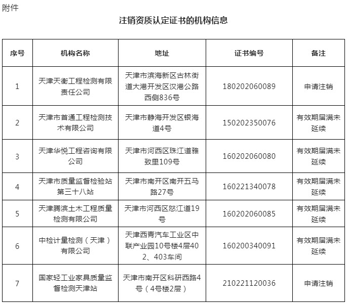 根据《中华人民共和国行政许可法》和《检验检测机构资质认定管理办法》的规定,决定对天津天衡工程检测有限责任公司等机构资质认定证书予以注销。