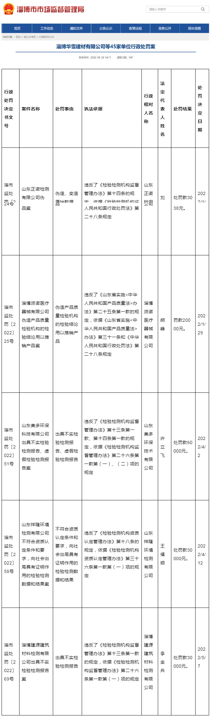 近日,山东省淄博市市场监督管理局网站发布淄博华雪建材有限公司等45家单位行政处罚案。其中,山东正诺检测有限公司、山东美多环保科技有限公司、山东祥隆环境检测有限公司、淄博建源建筑材料检测有限公司等多家机构被罚。