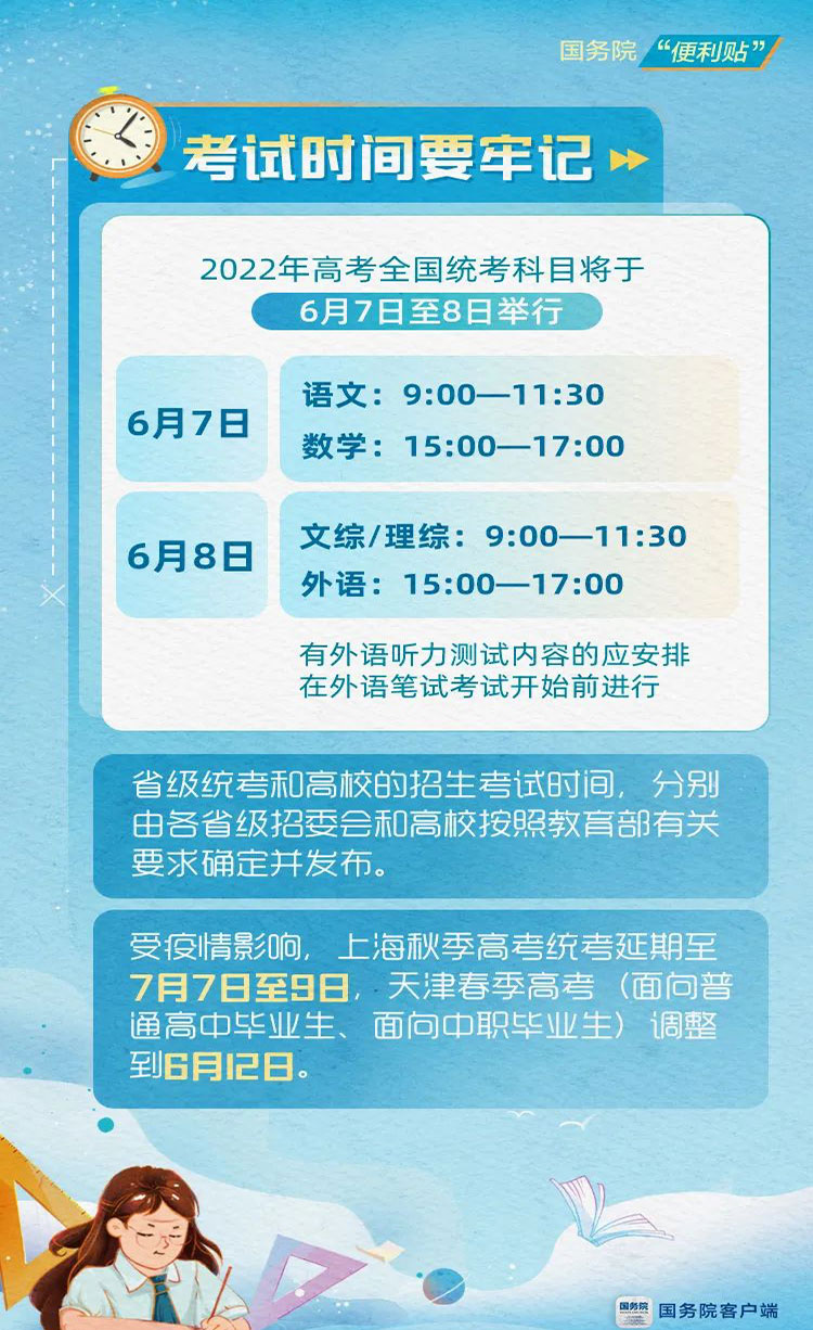 2022年普通高等学校招生全国统一考试7日开考。据教育部统计,今年全国有1193万考生报名参考,比去年增加115万,设普通考场33万个,安排监考及考务人员102万人。从报名情况看,湖南、四川、河北等省份报名人数均有较明显增加,天津等省市同去年相比略增,甘肃等地则略有减少。根据疫情防控形势,上海市秋季高考统考延期至7月7日至9日举行。