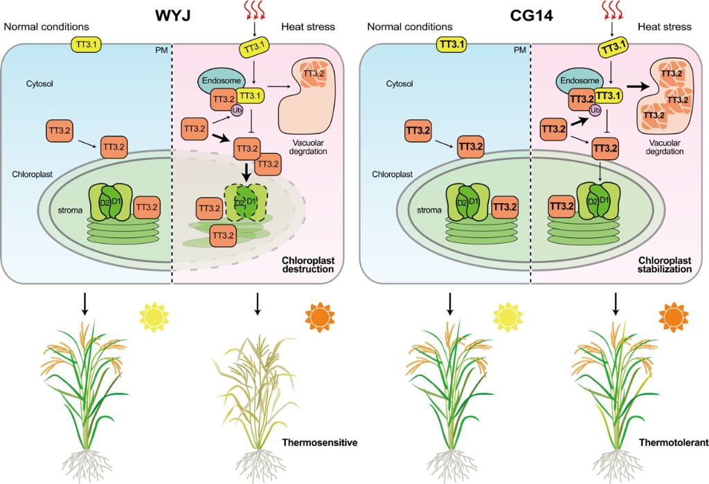 中国科学院分子植物科学卓越创新中心林鸿宣研究团队和上海交通大学林尤舜研究团队合作,在研究中发现调控水稻高温抗性的新机制,这项成果不仅首次揭示了在一个控制水稻数量性状的基因位点(TT3)中存在由两个拮抗的基因(TT3.1和TT3.2)组成的遗传模块调控水稻高温抗性的新机制和叶绿体蛋白降解新机制,同时发现了第一个潜在的作物高温感受器。该研究成果于6月17日在国际顶尖学术期刊《科学》上发表。