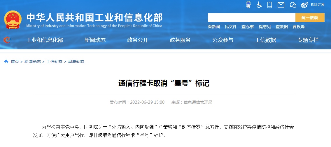 为坚决落实党中央、国务院关于“外防输入、内防反弹”总策略和“动态清零”总方针,支撑高效统筹疫情防控和经济社会发展,方便广大用户出行,即日起取消通信行程卡“星号”标记。