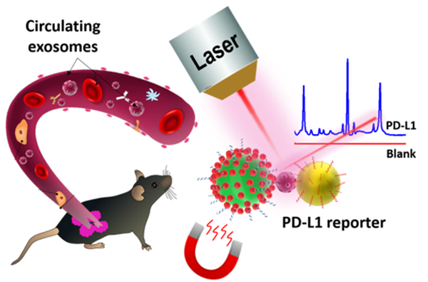为了检测PD-L1,研究人员首先制备了具有SERS活性的磁性纳米复合材料,同时又制备了SERS纳米标签。然后,科研人员用特定的适配体修饰这些纳米粒子,从而可以特异性地捕获循环外泌体PD-L1,形成三明治夹层式的SERS探针,通过分析拉曼报告信号,可以定量分析PD-L1生物标志物。该方法非常灵敏,可检测低至4.31ag/mL的PD-L1。进一步研究表明,在小鼠模型中,科研人员可以通过分析肿瘤中PD-L1随时间变化的表达水平,进而分析小鼠肿瘤发展情况。