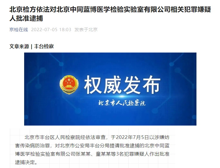 北京市丰台区人民检察院经依法审查,于2022年7月5日以涉嫌妨害传染病防治罪,对北京市公安局丰台分局提请批准逮捕的北京中同蓝博医学检验实验室有限公司张某某、童某某等3名犯罪嫌疑人作出批准逮捕决定。