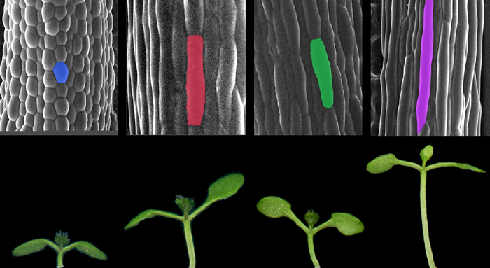 不同光照和温度条件下的拟南芥细胞(上)和幼苗(下)。最右图所示的幼苗在阴凉和温暖的温度下显示出加速生长。