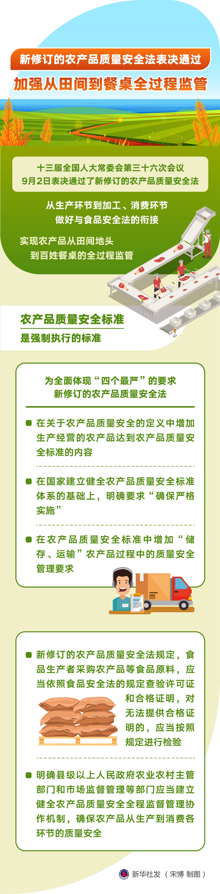 十三届全国人大常委会第三十六次会议2日表决通过了新修订的农产品质量安全法,从生产环节到加工、消费环节,做好与食品安全法的衔接,实现农产品从田间地头到百姓餐桌的全过程监管。