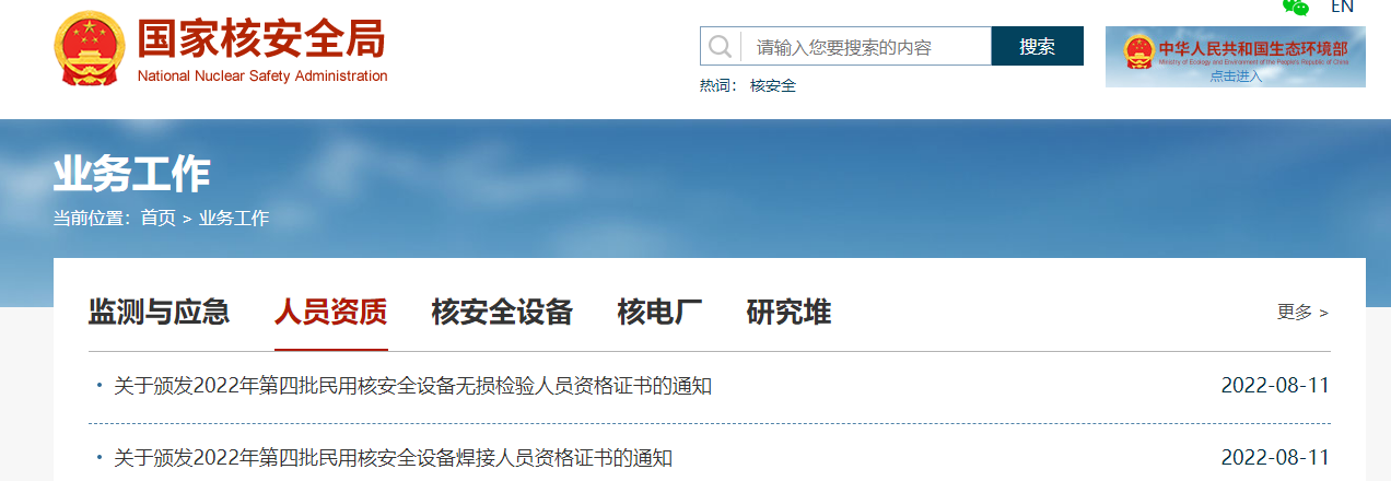 核安全设备无损检验人员资格、核设施操纵人员资格:国家核安全局人员资质查询栏目