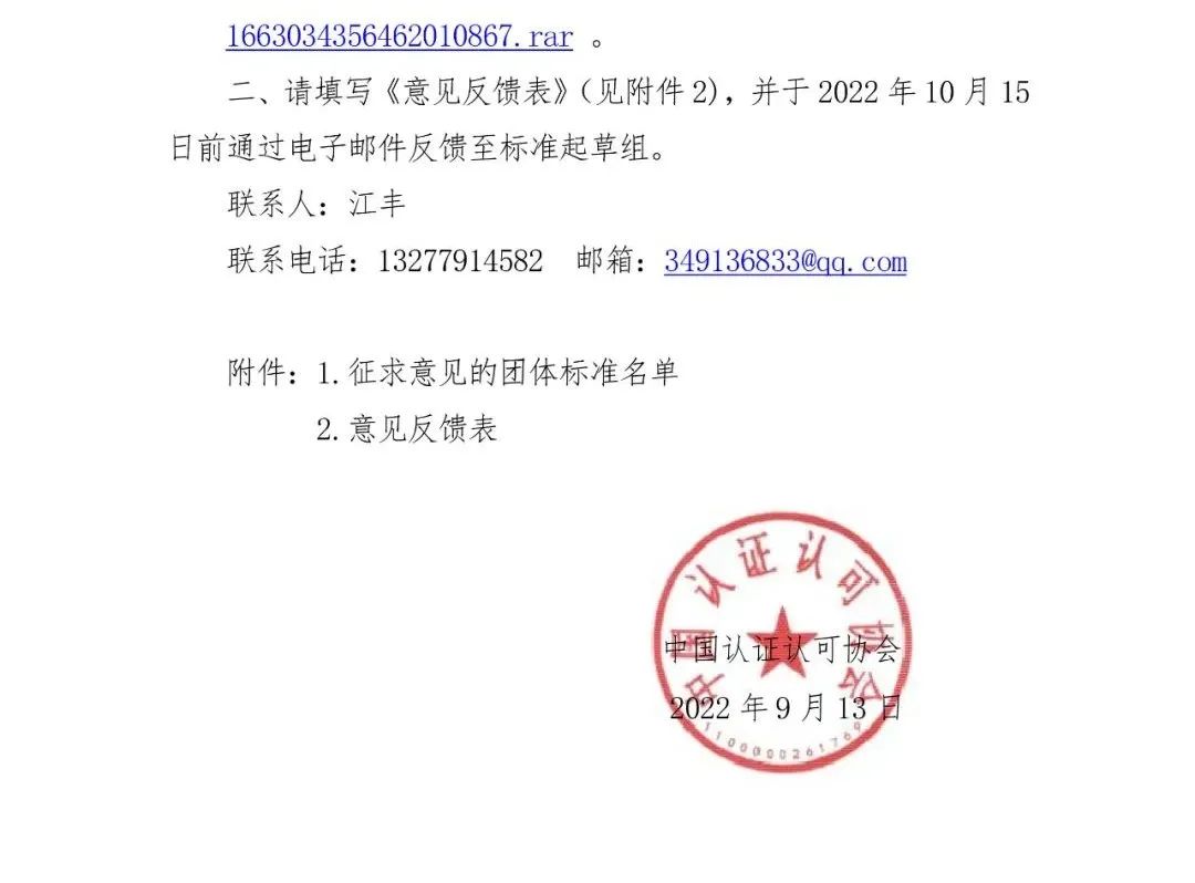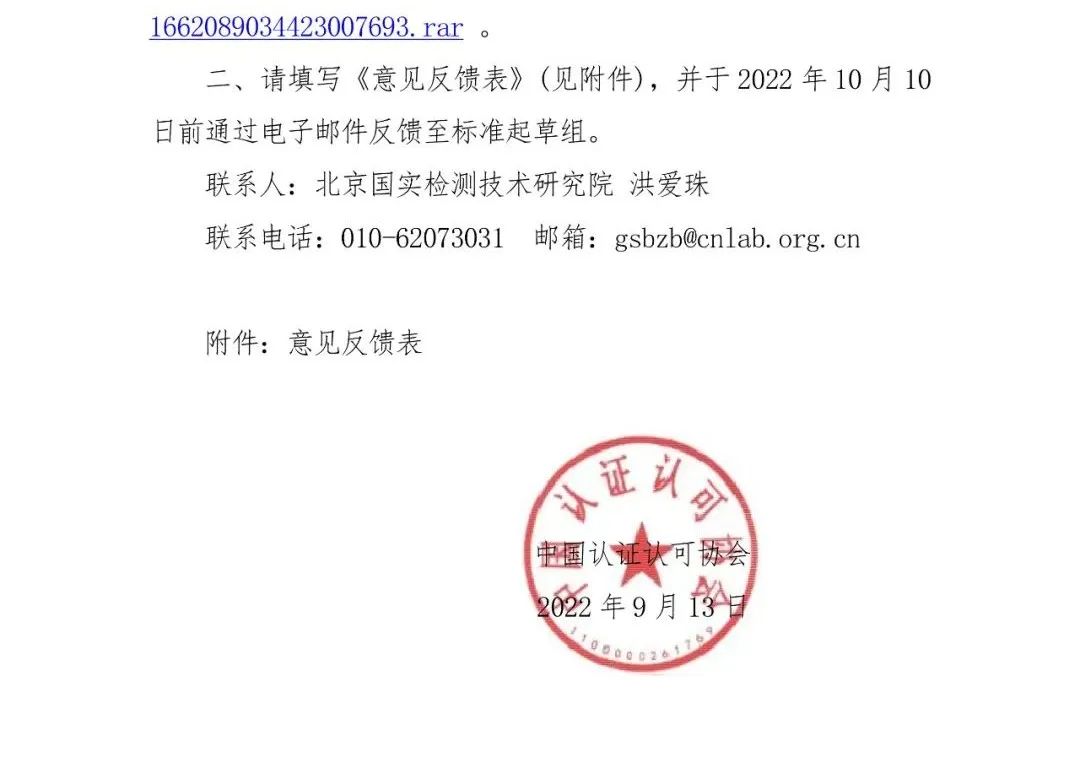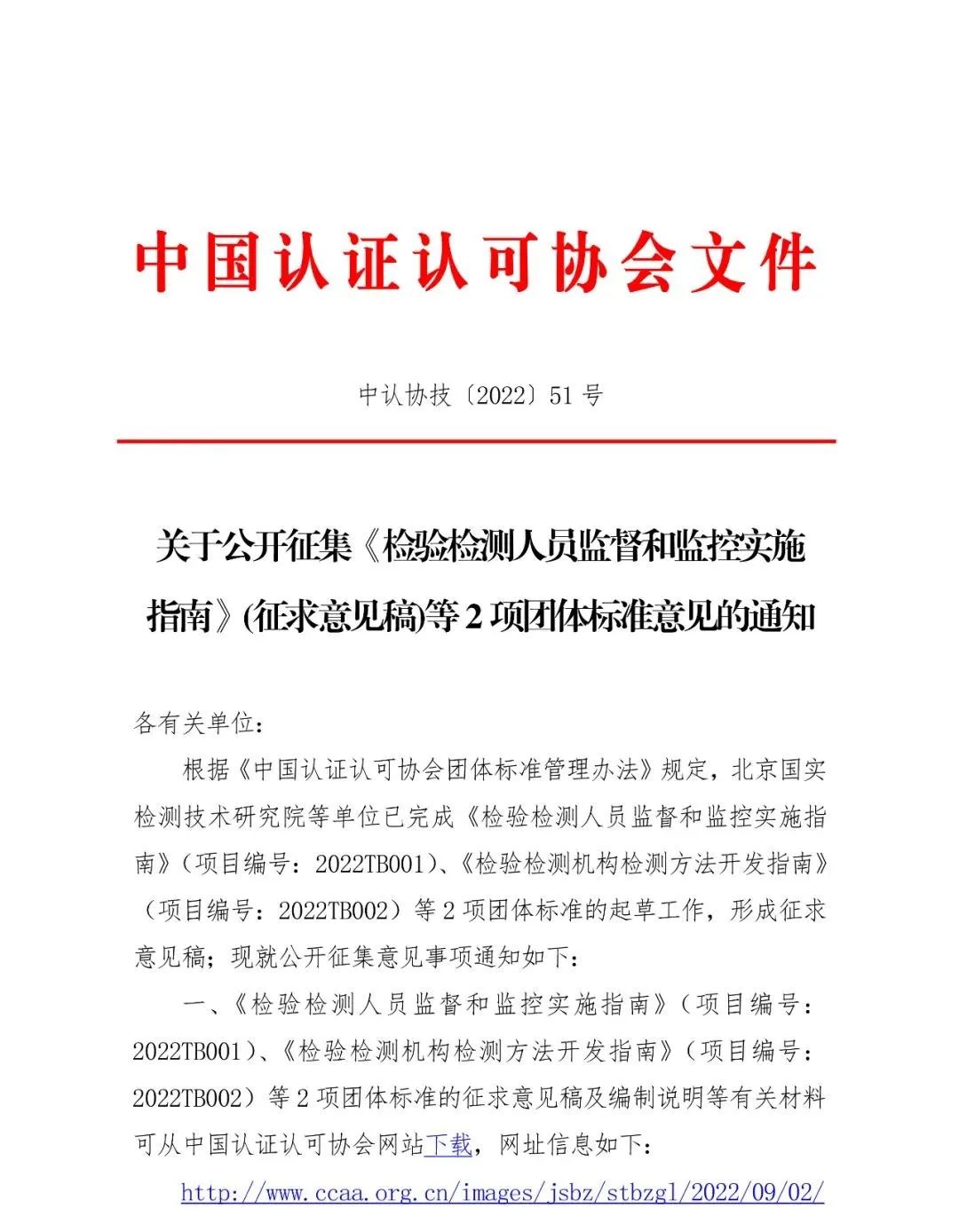近日,中国认证认可协会发布通知,根据《中国认证认可协会团体标准管理办法》规定,《检验检测人员监督和监控实施指南》(项目编号:2022TB001)、《检验检测机构检测方法开发指南》(项目编号:2022TB002)、《化学检测领域实验室设备实施检定和校准技术指南》(项目编号:2021TB021)等 6 项团体标准的起草工作已完成,现正公开征求意见,详情如下: