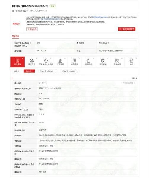 9月22日,苏州市生态环境局作出苏环行罚字﹝2022﹞第48号处罚决定书。信用中国(江苏苏州)官网载明:昆山明珠机动车检测有限公司构成伪造机动车排放检验结果或者出具虚假排放检验报告、未按照国家和省规定的排放检验方法、技术规范进行检验。