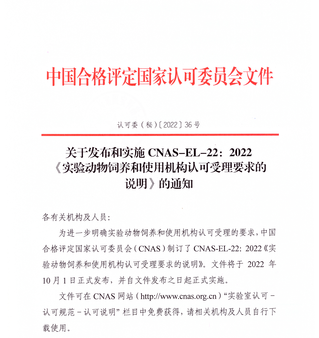 关于发布CNAS-EL-22:2022《实验动物饲养和使用机构认可受理要求的说明》的通知