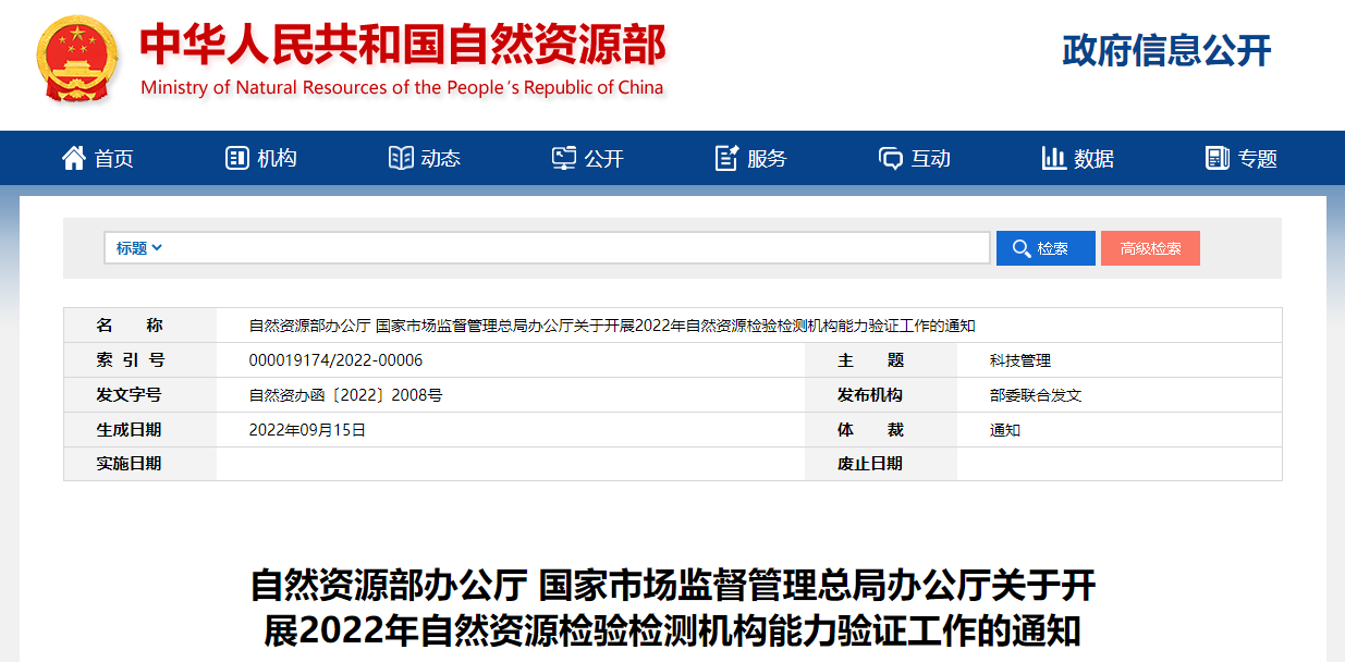 近日,自然资源部、 国家市场监督管理总局联合发布通知,组织开展2022年自然资源检验检测机构能力验证工作,本次能力验证计划项目共9项。详情如下:
