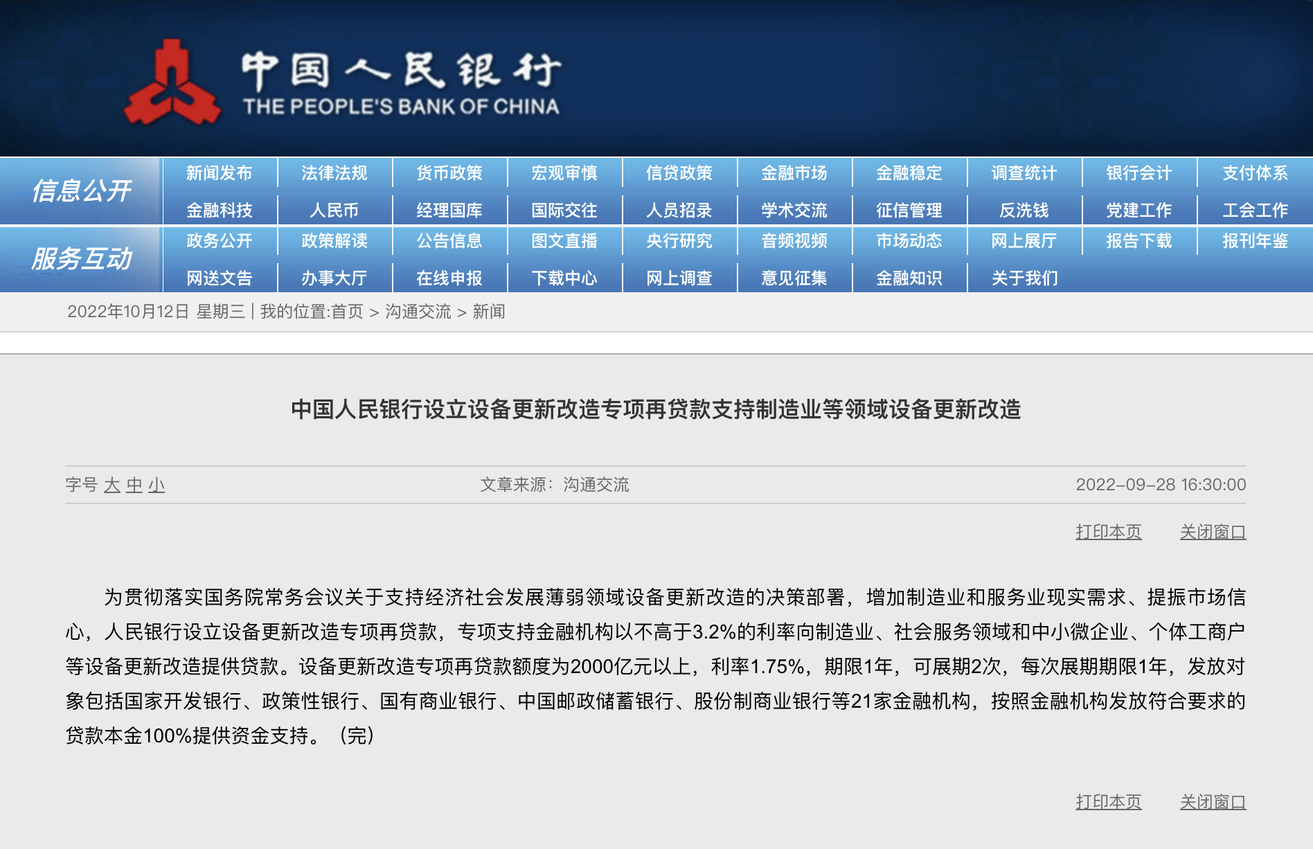 9月28日,又一政策落地,中国人民银行宣布设立设备更新改造专项再贷款,额度2000亿元以上,支持金融机构以不高于3.2%的利率向10个领域的设备更新改造提供贷款,加上此前中央财政贴息2.5个百分点,今年第四季度内更新改造设备的贷款主体实际贷款成本不高于0.7%。
