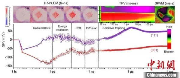 为更好了解纳秒(十亿分之一秒)范围内高效电荷分离机制,研究团队使用时间分辨光发射电子显微镜发现,光生电子在亚皮秒(一皮秒等于一万亿分之一秒)时间尺度就可以选择性的转移到特定晶面区域,电子在超快的时间尺度上可以从一个表面移动到另一个表面。随后,为直接观察电荷转移过程,研究团队进行瞬时光电压分析,发现随着时间尺度从纳秒到微秒(一百万分之一秒)的发展,空穴逐渐出现在含有缺陷的晶面。
