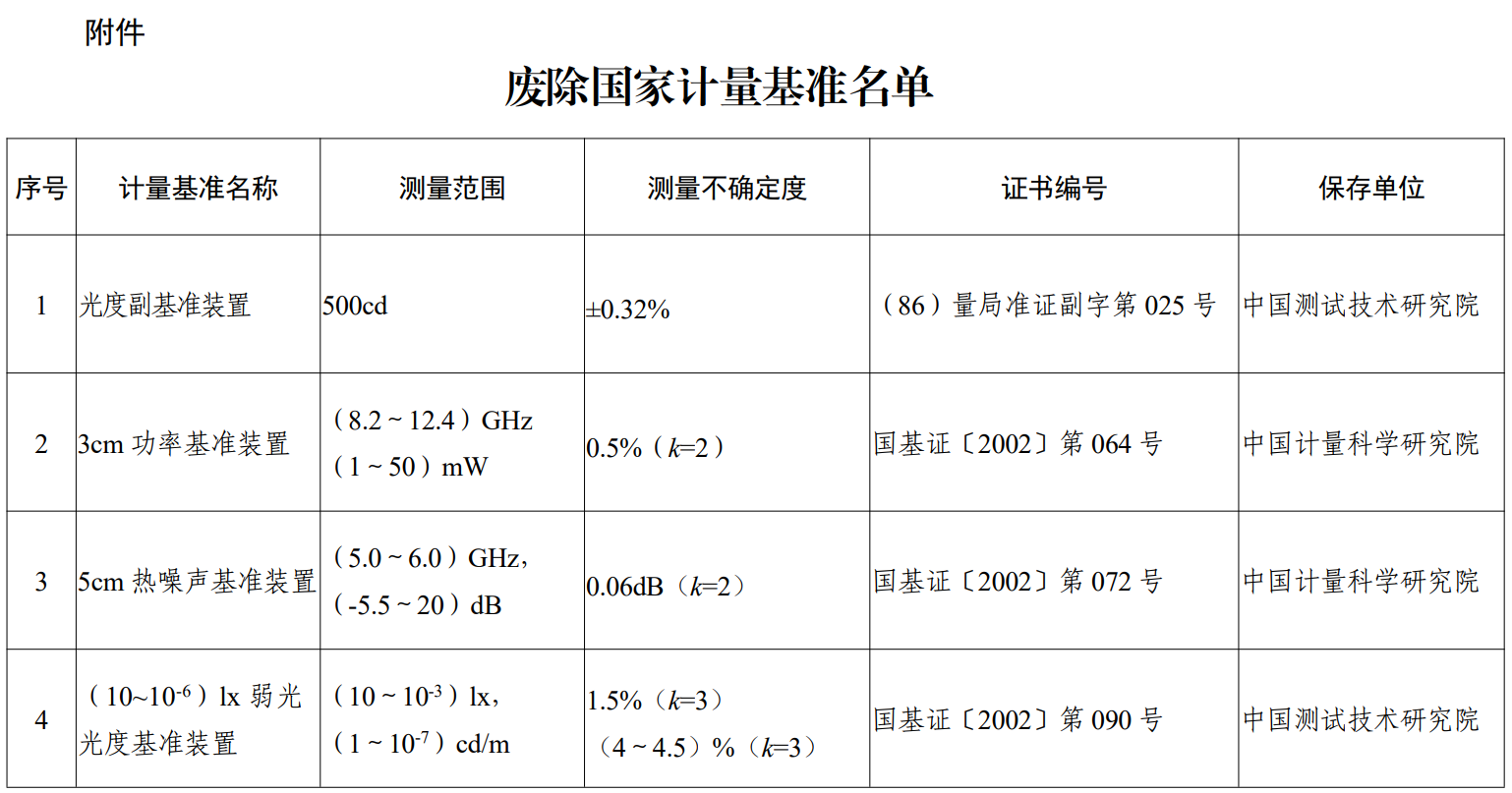 根据《中华人民共和国计量法》《中华人民共和国计量法实施细则》以及《计量基准管理办法》相关规定,废除“光度副基准装置”、“3cm功率基准装置”、“5cm热噪声基准装置”、“(10~10-6)lx弱光光度基准装置”等4项国家计量基准,撤销原国家计量基准证书。