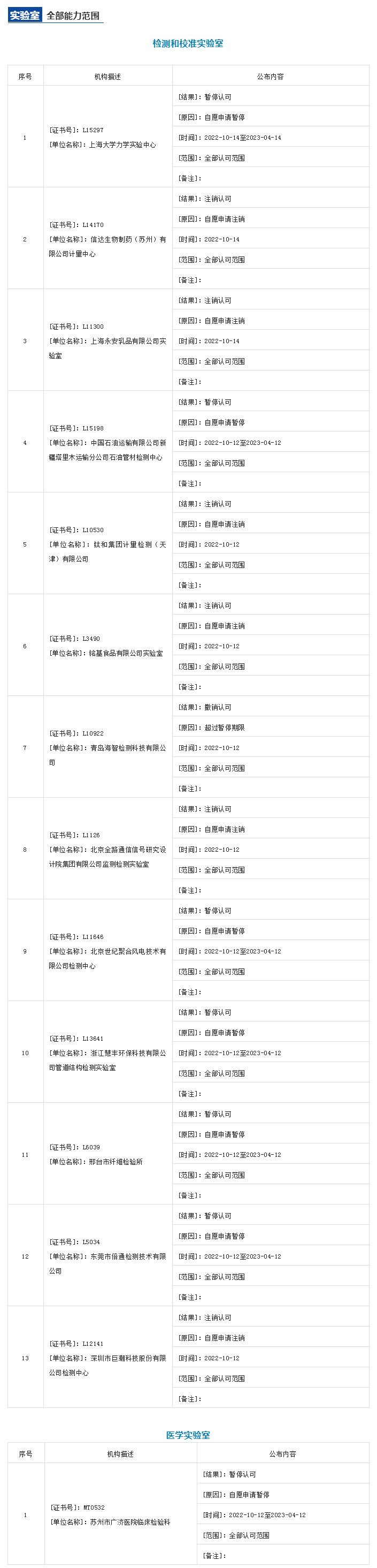 据中国合格评定国家认可委员会消息,10月上半月共计14家机构暂停/撤销/注销认可资质。