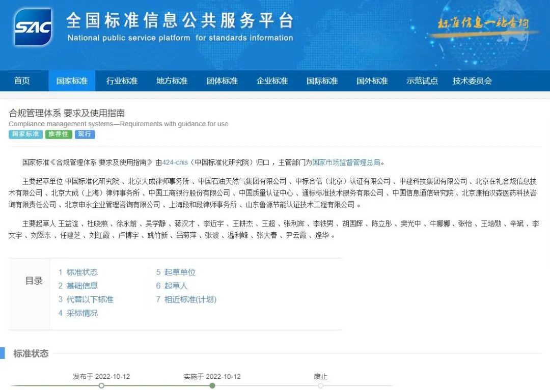 2022年10月12日,GB/T35770-2022《合规管理体系要求及使用指南》正式发布,该标准等同于国际标准ISO37301:2021,是我国又一重磅级的管理体系认证标准,将对我国企业及组织的合规管理具有指导意义。