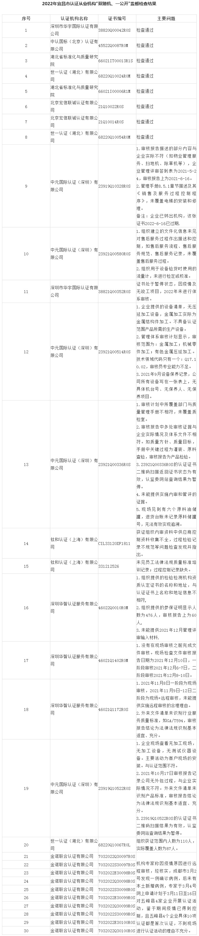 2022年宜昌辖区内共抽取了9个认证机构30张认证证书,其中17张质量管理体系认证证书,13张为环境管理体系证书、职业健康管理体系证书和建设施工行业体系证书等。30张证书中有8张是我局联合省局专家实施现场检查,其余22张由我局组织各县市区局监管人员开展了相关的检查工作。