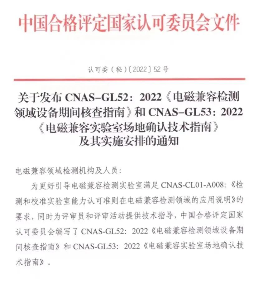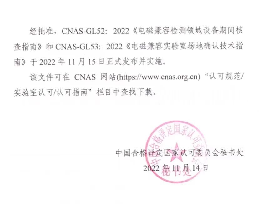 近日,中国合格评定国家认可委员会发布关于发布CNAS-GL52:2022《电磁兼容检测领域设备期间核查指南》和CNAS-GL53:2022《电磁兼容实验室场地确认技术指南》及其实施安排的通知,以上文件于2022年11月15日正式发布并实施。